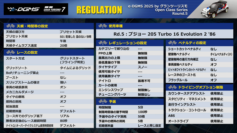 今回のレギュレーションは、1986年の世界ラリー選手権(WRC)チャンピオンカーで、伝説のプジョー車である205 Turbo 16 Evolution 2ということで、e-DGMS史上初のスノーレース。1986年当時を意識し、「ABS禁止」も設定された。前回のRd.4でも選手たちを大きく苦しめたこの難題だが、選手はどのように立ち向かうのか。