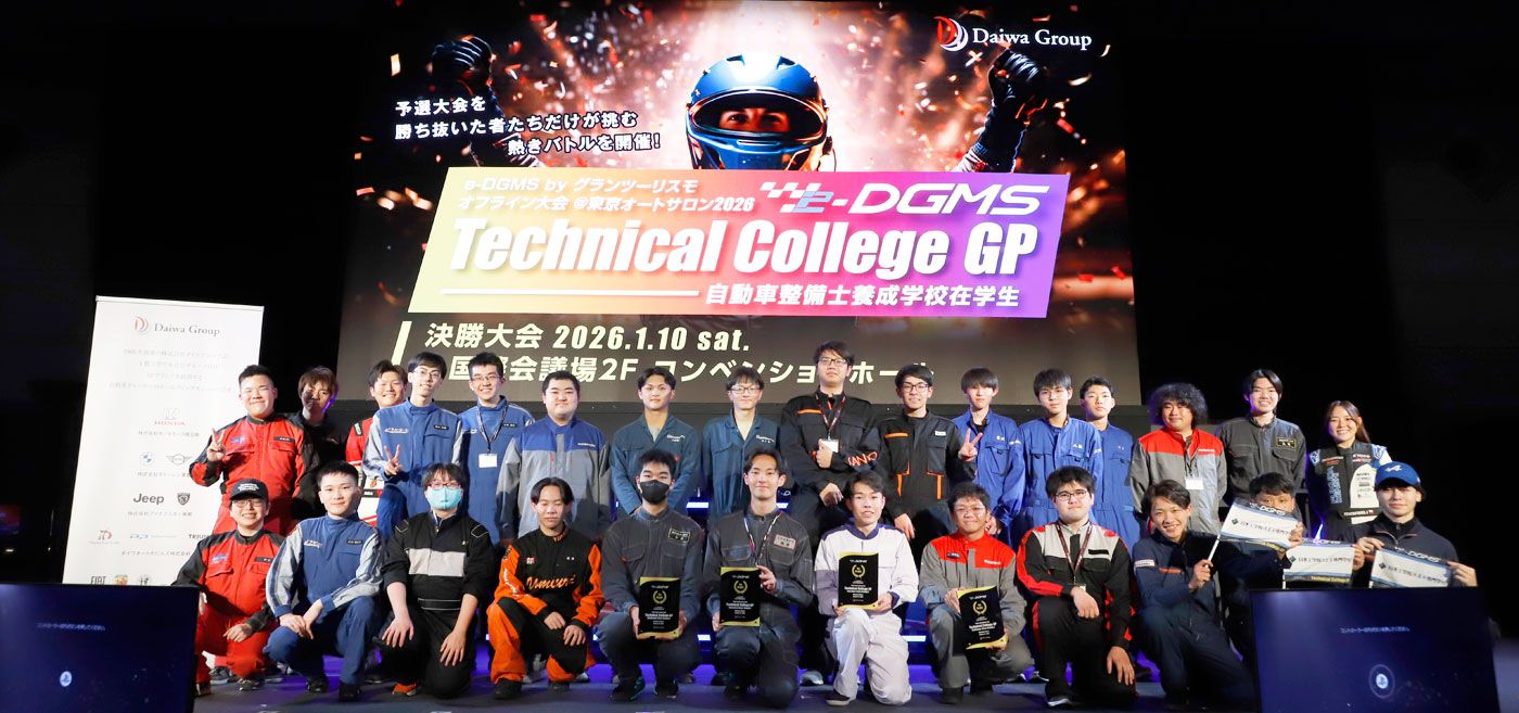2026年1月10日(土)、e-DGMS by グランツーリスモ @ 東京オートサロン2026 Technical College GP 決勝大会を開催しました。この大会は、TOKYO AUTO SALON 2026(会期:2026年1月9日(金)~11日(日)/場所:幕張メッセ)会場内が舞台となる e-DGMS 3度目のオフライン戦。